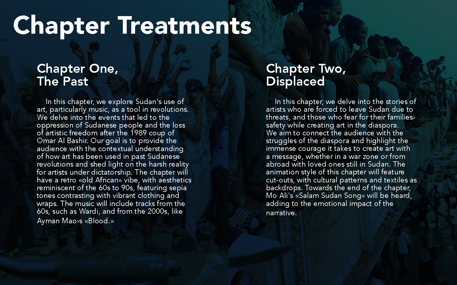 The deck opens with an exploration of the cultural and artistic movements that helped fuel the Sudanese revolution, establishing the thematic foundation of the film. Key narrative components—including central figures, story structure, and the integration of animation—are introduced progressively to support understanding and pacing. Editorial sequencing was used to guide the reader through the project’s core ideas without overwhelming the content.